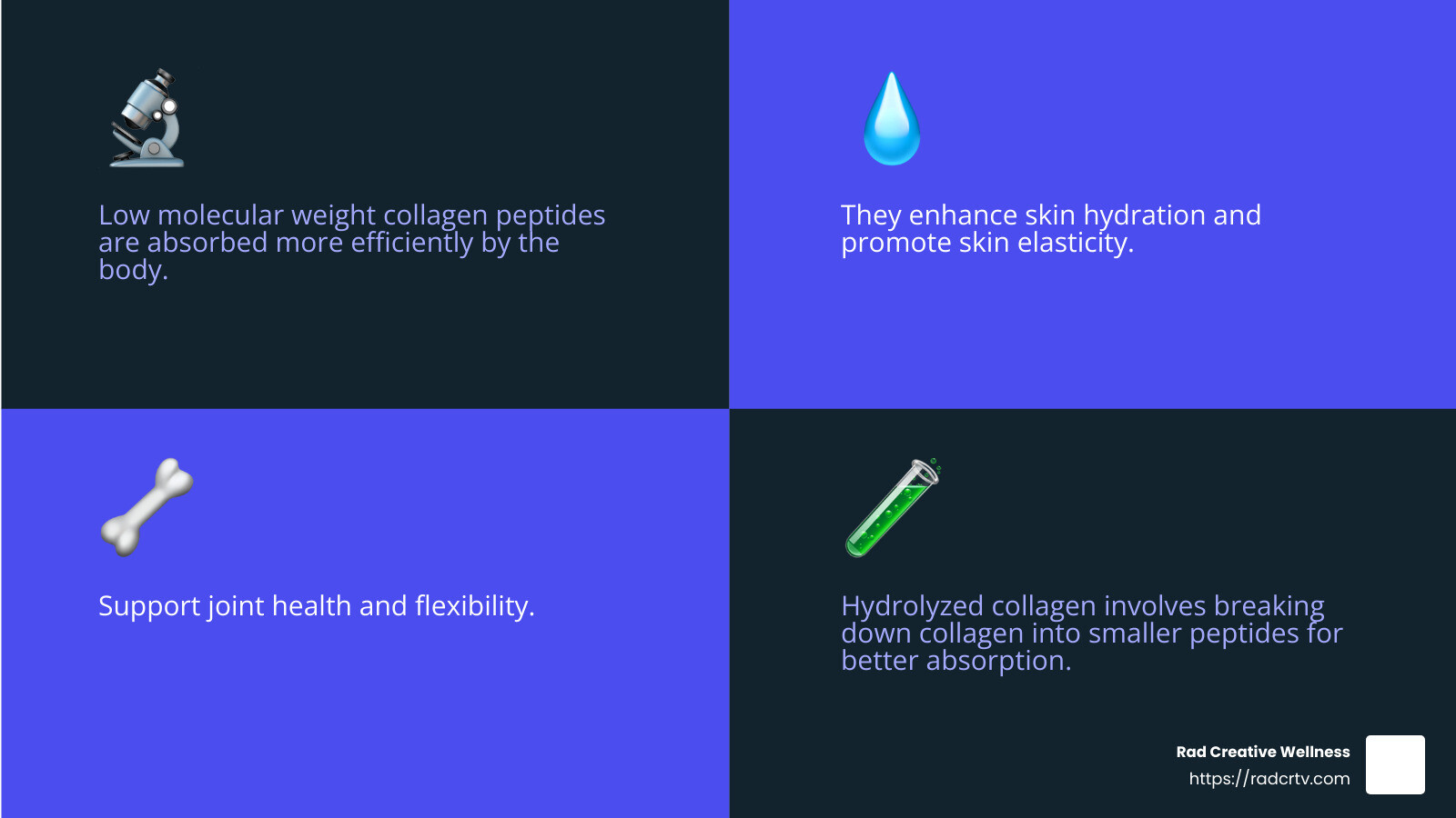Low molecular weight collagen peptides are tiny fragments of protein that are easier for your body to absorb. They offer several benefits: