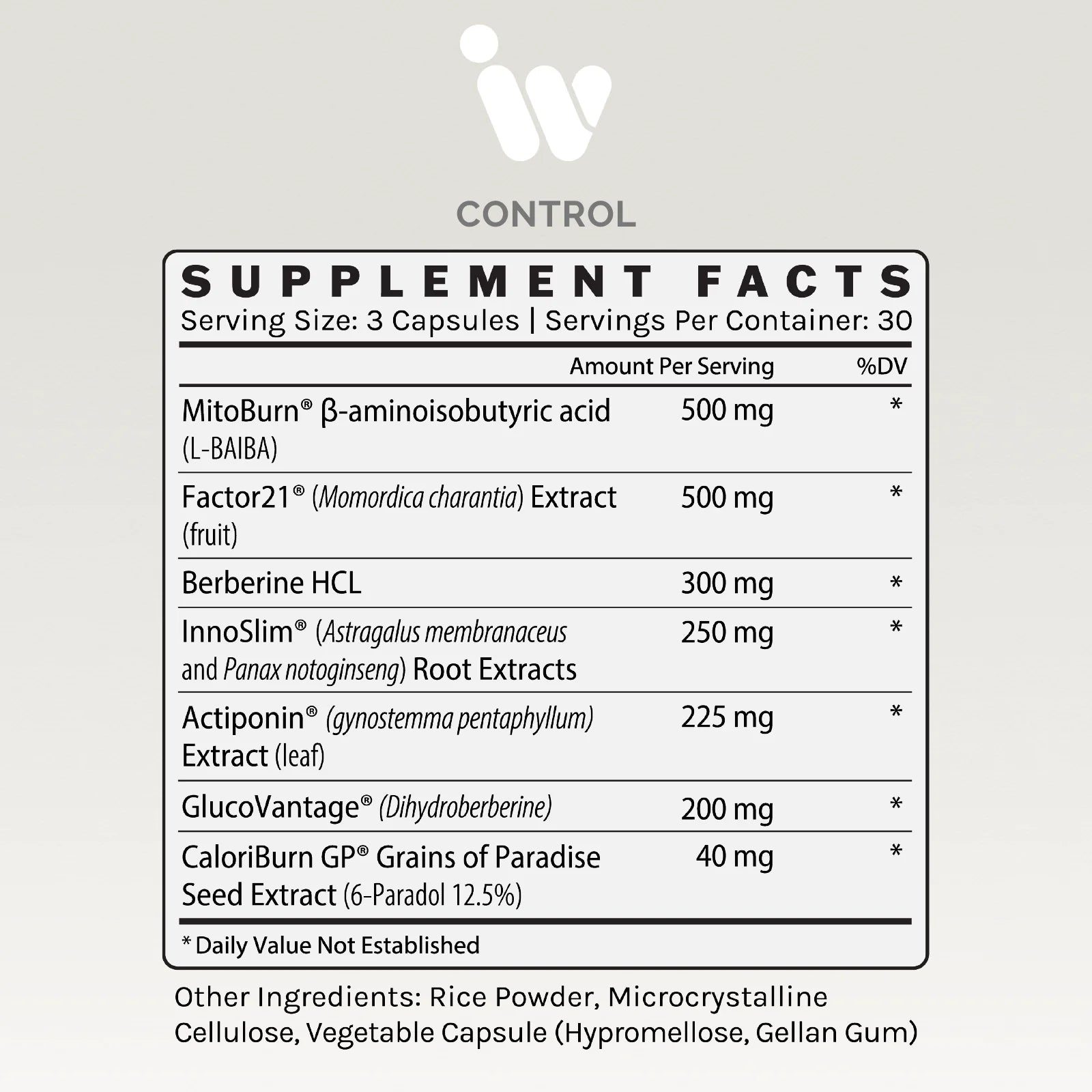 With an innovative blend of scientifically backed ingredients such as MitoBurn®, GlucoVantage®, Factor21® Bitter Melon Extract, InnoSlim®, Actiponin®, and CaloriBurn GP®, Control delivers powerful metabolic support designed to improve body composition and promote lasting results.