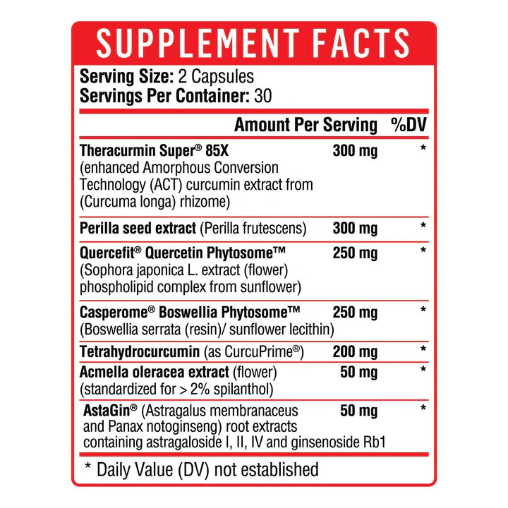 Curcumin, a powerful anti-inflammatory from turmeric, is enhanced in Theracurmin Super® 85X for superior bioavailability. CurcuPrime® (Tetrahydrocurcumin), a highly active curcumin derivative, further enhances Resolve+ by reducing key inflammation markers such as IL-1, IL-6, TNF-α, and PGE2, delivering maximum potency.