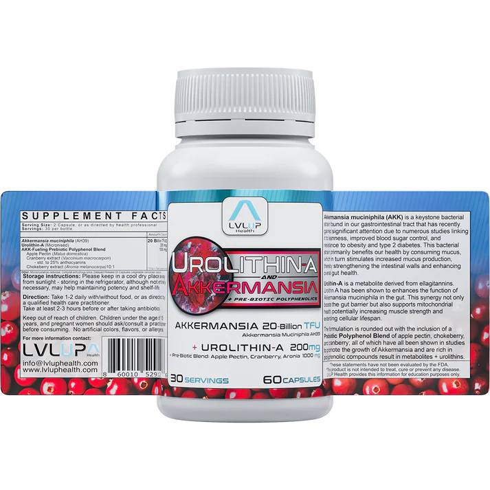 Experience the ultimate synergy of Urolithin A, Akkermansia muciniphila (AKK), and Prebiotic Polyphenols in one groundbreaking formula. This unique blend enhances gut microbiome function, strengthens the intestinal barrier, and supports metabolic wellness at the cellular level.